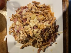 When walking in, the vibe was okay. Our server was great and very open that it was one of her first days working there. The food was excellent. You could tell that all the veggies and fruit were fresh. I got the Hawaiian ACP, which has pineapple, ham, chicken, over rice with cheese sauce on top, and it was phenomenal. Not to mention the salsa; you could tell it was freshly made there.