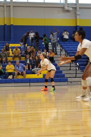 Freshman Autumn Wyatt and senior Kayden Cupid ready to dig up the pass in back row.