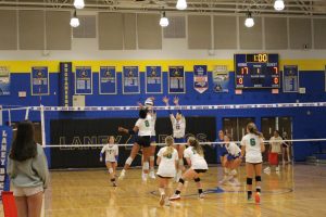 Senior Kayden cupid and Freshman Kelsey Lykins blocking the ball as the other team hits.