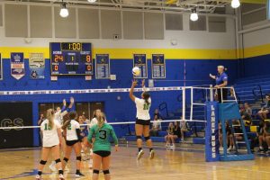 Sophomore Jayden Stout spiking the ball in the outside position