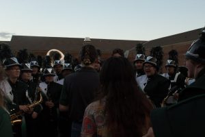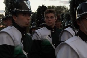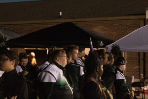 Marching Trojans waiting outside of field after performance