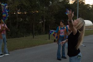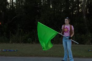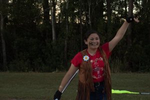 Color guard member Natalia smiles big while practicing before the competition