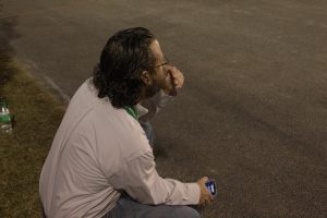 Band Director Jason Seip on the edge of his seat observing the performance