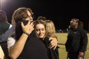 Junior Drake Benton hugging Allie Stevens and Hillori Adams