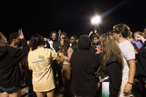 Marching Trojan Alumn Jacob Moore helps set up drum major’s stand