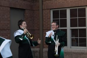 Trumpet section leaders Zayn Poulin and Nevin Seip messing with each other while practicing
