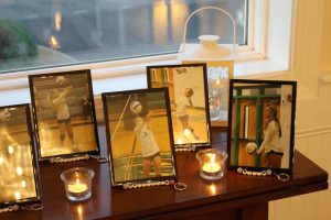 Table decorated with pictures of each player, a lit candle and a keychain with each of their names.