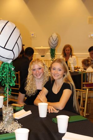 The Tables at the banquet decorated with the school colors green,white and black with a volleyball in the middle.