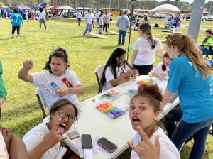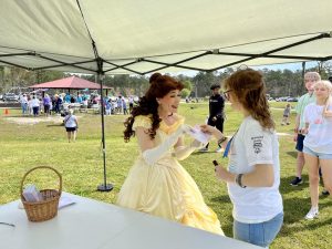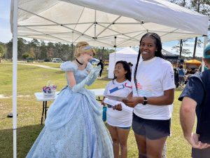 In between events, students had the opportunity to walk around and experience the other activities that were set up. The activities set up were things like cornhole and balls to pass around. There were tents with bongo drums you could play and a table to make friendship bracelets or play board games. There were also two Disney princesses, Cinderella and Belle, that you could meet, take a picture with, and receive an autographed card.