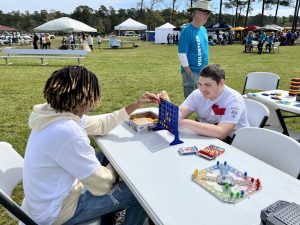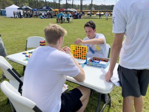 Junior Kaden Bryant playing Connect 4 with Jason Radford after finishing their events.