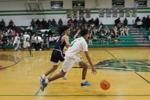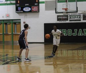 Sophomore Andre Thomas,, making his way around Hoggard to the Trojans side of the court.