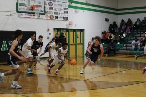 Freshman Motashi Lance, making his way to the basketball goal for his team.