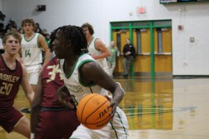 Senior, Josiah Johnson, dribbles the ball on offense.