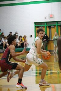 Freshman, Isaac Clarida, dribbles the ball towards the basket.