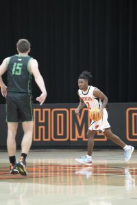 Junior Royce Metters bringing the ball up the court while being pressured by defenders on the other team.