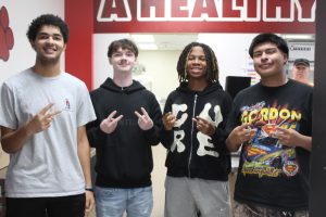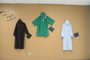 Making their way to the cafeteria, the leadership students passed students celebrating their A and A/B honor rolls with pizza and fun while also passing a display of senior cap and gowns from West Brunswick High School, South Brunswick High School, and the Early College, with the words “Which one will YOU wear?” written above.