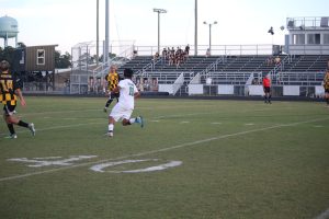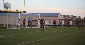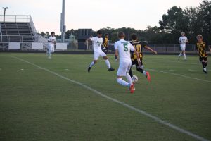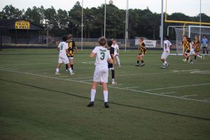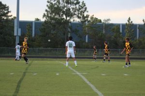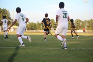On Thursday, September 25, the junior varsity boy’s soccer team faced off against the Topsail Pirates in an away match that ended in a narrow 1-0 loss for the Trojans. After a long hour-long bus ride, the Trojans had only a few minutes to stretch and warm up before kickoff.Despite the quicker preparation, the team came together for their traditional pre-game huddle and prayer before the starting eleven took the field, ready to compete.