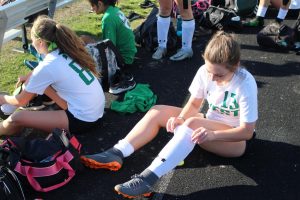 Joi Sturdivant the Varsity Women’s Soccer goalkeeper recuperates after getting scored on.