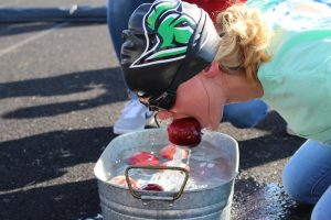 Ms. Gore put up an amazing fight during apple bobbing, but in the end, she bites down heavily with a face of defeat.