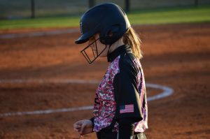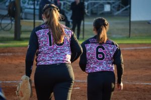Gracie Griffin and Peyton Daniels walking back to the dugoutto switch positions after 3 outs for North Brunswick, in the bottom of the 4th inning