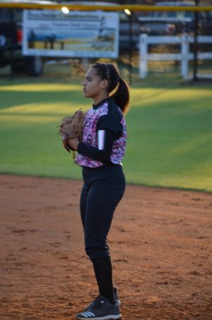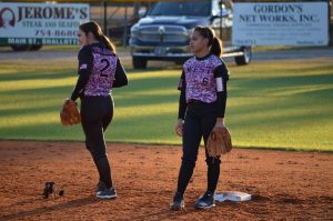 Savannah Branch and Peyton Daniels waiting for the next hitter while in the field