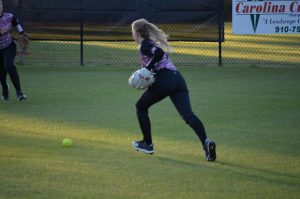 Morgan Beeler running after stray ball in the field hoping to make a good play