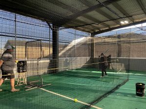 Coach Griffin soft-tossing in the cage while helping girls with their swing.